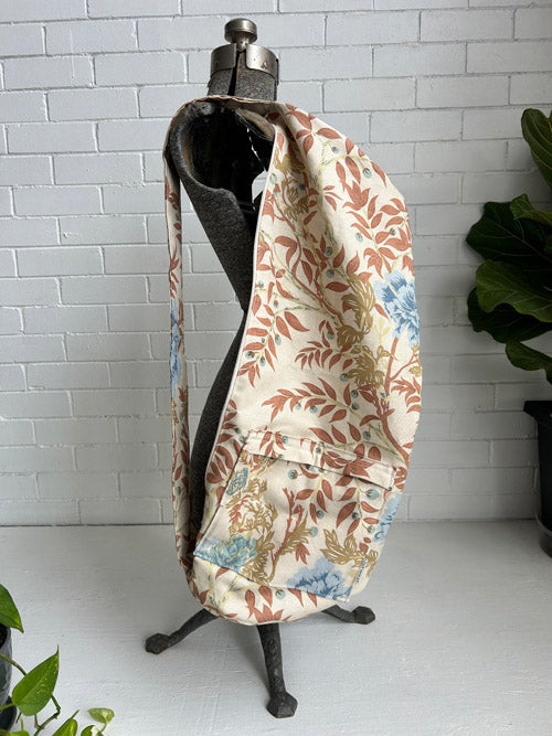 This yoga mat bag was the first product we ever made from upcycled textiles. These mat bags are larger than they appear to hold your mat and lots of other accessories.